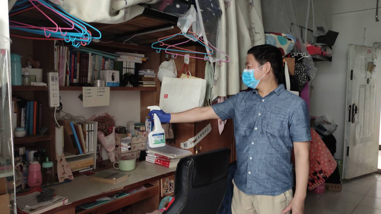 學院領導班子成員悉數到場,部分教師遠道而來,加入勞動隊伍,分別到南區7、10棟,北區9A、3B的97間本科、研究生畢業生宿舍進行消毒打掃。學院黨委書記韓昕在打掃前傳達了學校關于畢業生返校工作相關會議精神,強調要消除宿舍內存在的安全隱患,用更充分的準備和更嚴格的措施,保障學生安全返校。教職工們自覺形成各小組,并肩作戰,帶著消毒打掃工具進入每間畢業生宿舍,開窗通風,屋內消毒,清潔地面,歸整桌椅等進行了一場熱火朝天的“衛生總動員”。老師們來到學生宿舍,認真地清掃垃圾、洗刷水池、擦拭桌面,不放過一些衛生死角。清潔過后的宿舍,物品擺放整齊,室內空氣清新,門把手和公共使用區消殺徹底,宿舍全面清潔灑掃。“宿舍已清掃,空調已清洗,歡迎回家”宿舍留言條的短短幾句話,字里行間流露出學院對學生們歸來的期待。