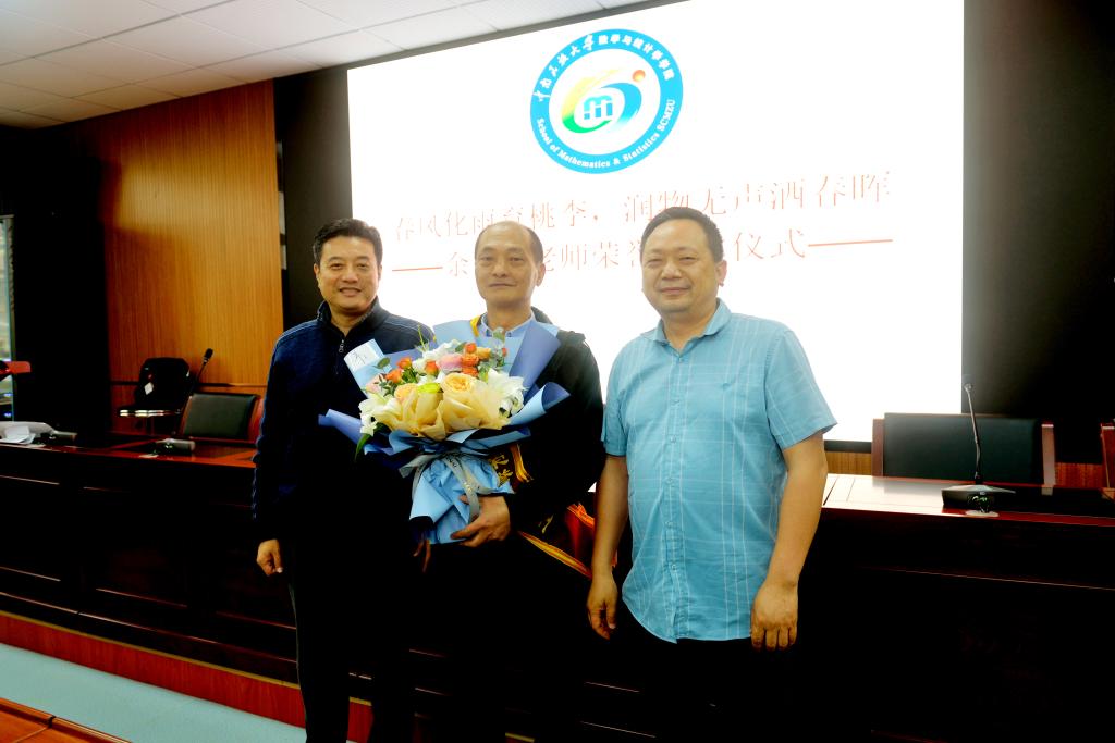 2022年4月28日下午,數學與統計學學院舉行余啟港老師榮譽退休儀式。儀式由學院黨委書記李海濤、院長胡軍浩主持。
