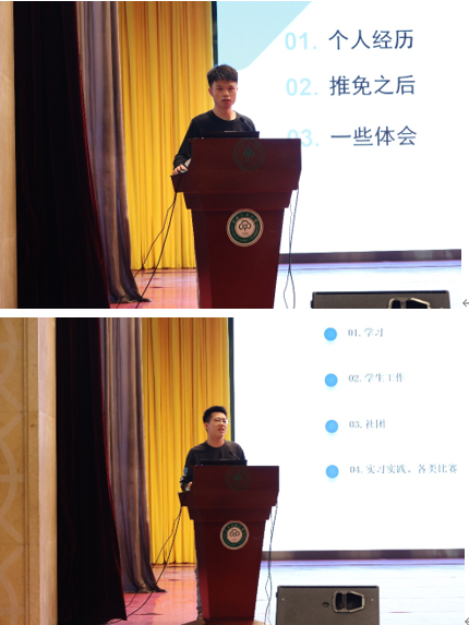 2018級尚昊、劉嘉寶、劉平春、方小宇、胡靖東5位優秀畢業生結合他們的大學生活,講述了他們的故事和經歷,從學業規劃、考研、就業、學生工作、實習實踐、創新競賽等不同的方面進行了經驗分享,給學弟學妹們傳經送寶,希望學弟學妹們保持積極樂觀的心態,做好規劃,明確目標,找準方向,努力嘗試、努力學習、努力生活,勇敢的面對困難并堅持下去。答疑解惑環節,氣氛熱烈活躍,同學們踴躍提問,5位優秀畢業生耐心細致一一解答。