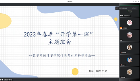 春風(fēng)浩蕩滿目新,揚(yáng)帆奮進(jìn)正當(dāng)時。為落實(shí)教育部和湖北省教育廳關(guān)于春季學(xué)期安全開學(xué)的工作要求,引導(dǎo)學(xué)生踔厲奮發(fā)迎接新學(xué)期。近日,我院各班級相繼召開《開學(xué)第一課》教育主題班會,學(xué)院各班級班導(dǎo)師擔(dān)任《開學(xué)第一課》主講人,因仍有部分學(xué)生未返校,此次班會采取線上線下相結(jié)合的方式進(jìn)行。