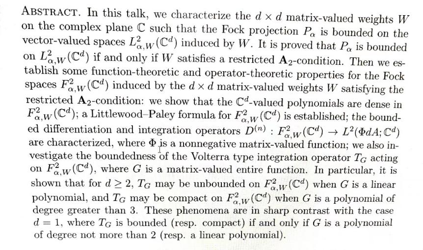 報(bào)告題目:Weighted norm inequalities and their applications on vector-valued Fock spaces