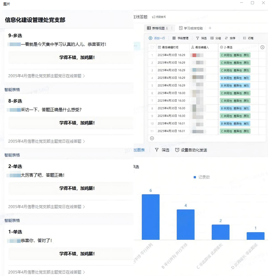 此次主題黨日活動改進了線上競答方式檢驗學習效果,采用信息化技術手段將“學、議、測”進行有機結合,使用企業微信智能表格實現自動判斷首答正確情況,自動統計答題結果、可視化呈現作答過程,配置自動化運維流程,營造濃厚學習氛圍。信息化建設管理處黨支部將持續鞏固學習成果,持續推動作風建設與業務工作深度融合,進一步強化黨員的思想自覺、政治自覺和行動自覺,為學校信息化建設注入紅色動能。