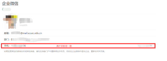 解決辦法:若企業微信已激活,先退出企業,步驟為設置-我的企業-中南民族大學-退出企業,更換信息門戶綁定的手機號,過5分鐘后去信息門戶搜“我的企業微信”, 看頁面上手機那一欄兩個手機號是否一致,一致用該手機號登錄,兩個手機號不一致或只有一個手機號按上面的提示操作。