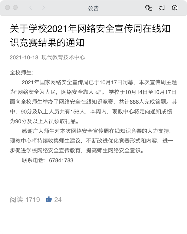 現代教育技術中心主頁發布網絡宣傳周輪播主圖,鏈接2021年國家網絡安全周官方網站,積極響應國家網絡安全周進校園,營造良好的網絡安全氛圍。通過企業微信向全校師生發布《網絡安全知識宣傳手冊》,以圖文并茂的形式展示了“網絡安全關乎國家安全”“謹防電信網絡詐騙”“做好個人信息保護”“保護你的密碼”“遠離網絡謠言”“防范惡意軟件”“關于手機安全風險”六大宣傳主題。10月14日至10月17日,中心面向全校師生開展了網絡安全在線知識競賽,共計686人完成答題。其中,90分及以上人員共有156人,參與人員有本預科生、研究生、教職工,覆蓋了全校三分之二的部門。通過參與知識競賽,師生能進一步掌握網絡安全基礎知識,提高網絡安全意識。