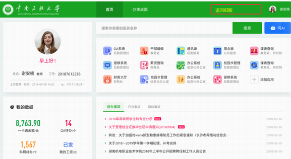 我中心將于3月8日(星期日)18:00對學校信息門戶界面進行升級改版,預計需要2小時,期間信息門戶系統可正常使用。給您帶來不便,敬請諒解。信息門戶新版界面有返回舊版按鈕,若對新版界面不適應可點擊返回舊版,如下圖所示。