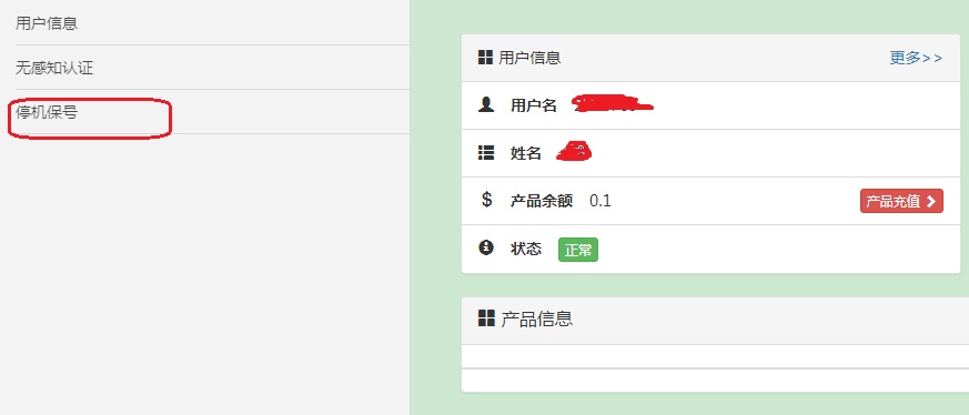 步驟3:點擊左側菜單欄“用戶”選項卡,進入子菜單,點擊“停機保號”選項卡,如下圖所示。