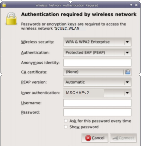 (2) 點(diǎn)擊 SCUEC_WLAN,會彈出配置窗口,無線安全類型(Wireless security)選擇“WPA & WPA2 企業(yè)(WPA & WPA2 Enterprise)”,認(rèn)證方式(Authentication)選擇“Protected EAP(PEAP)”,PEAP 版本(PEAP version)為“自動(dòng)(Automatic)”,內(nèi)部二階段認(rèn)證(Inner authentication)選擇“MSCHAPv2”,用戶名(Username) 和密碼(Password)欄對應(yīng)輸入“信息門戶賬號”及“密碼”,點(diǎn)擊“連接(Connect)”按鈕 保存設(shè)置并自動(dòng)連接。