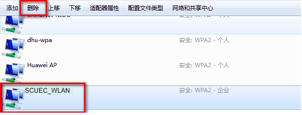 (1)如果您之前連過SCUEC_WLAN,且配置不成功的,請先“刪除”此網(wǎng)絡;