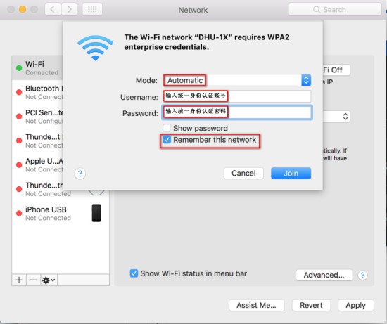 (2) 在彈出窗口中Username輸入“信息門戶賬號”、Password輸入“信息門戶密碼”,Mode選擇“自動(Automatic)”,并勾選“記住該網(wǎng)絡(luò)(Remember this network)”,點擊“加入(Join)”按鈕則會保存設(shè)置并自動連接;