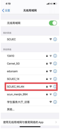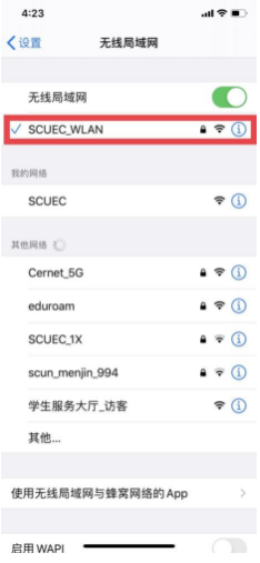 (1)打開“設(shè)置”——“WLAN”,開啟“無線局域網(wǎng)”,等待搜索到“SCUEC_WLAN”信號(hào);
