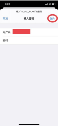 (2) 連接無線信號(hào)“SCUEC_WLAN”,用戶名密碼欄對(duì)應(yīng)輸入“信息門戶賬號(hào)”及“密碼”后,點(diǎn)擊“加入”即可;