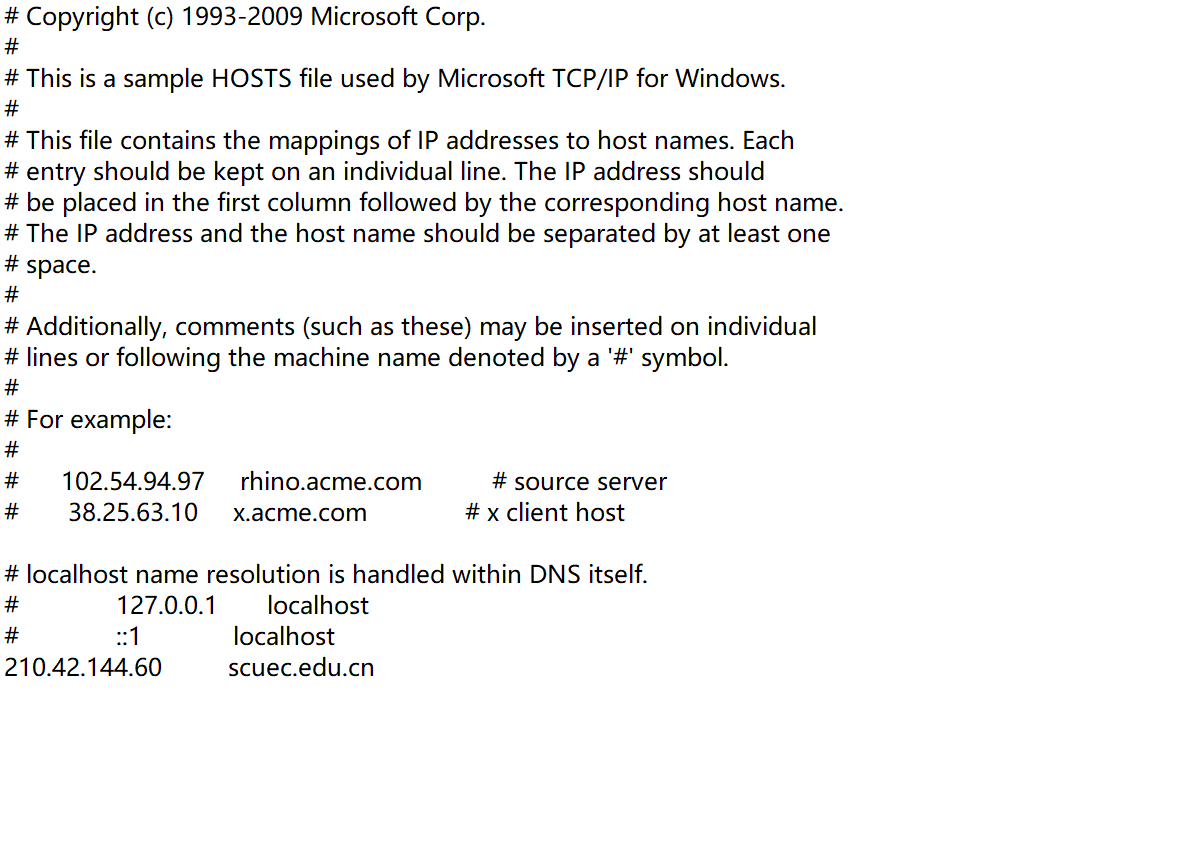 2、將hosts文件復制到桌面后,在里面追加一行:210.42.144.60 scuec.edu.cn;