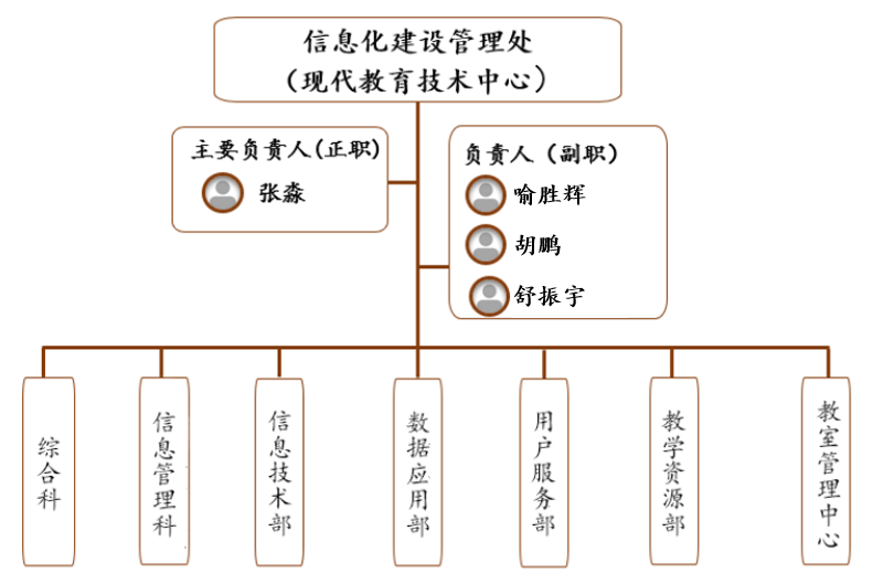 信息化建設管理處(現代教育技術中心)下設綜合科和信息管理科2個科級機構,設信息技術部、數據應用部、用戶服務部、教學資源部、教室管理中心5個內設機構。