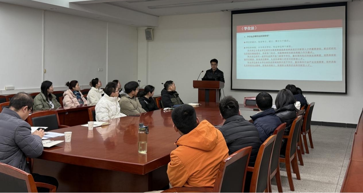 覃永華副院長帶領全體研究生學習了《中華人民共和國學位法》的主要內容,強調了學位申請人應具備的學術道德和學術規范,要求研究生在學習過程中堅決杜絕抄襲、剽竊等學術不端行為,切實維護學術誠信和學術尊嚴。同時,覃永華副院長希望同學們盡早做好職業規劃,轉變就業認識,用好校園平臺資源和相關政策,做好高質量就業。