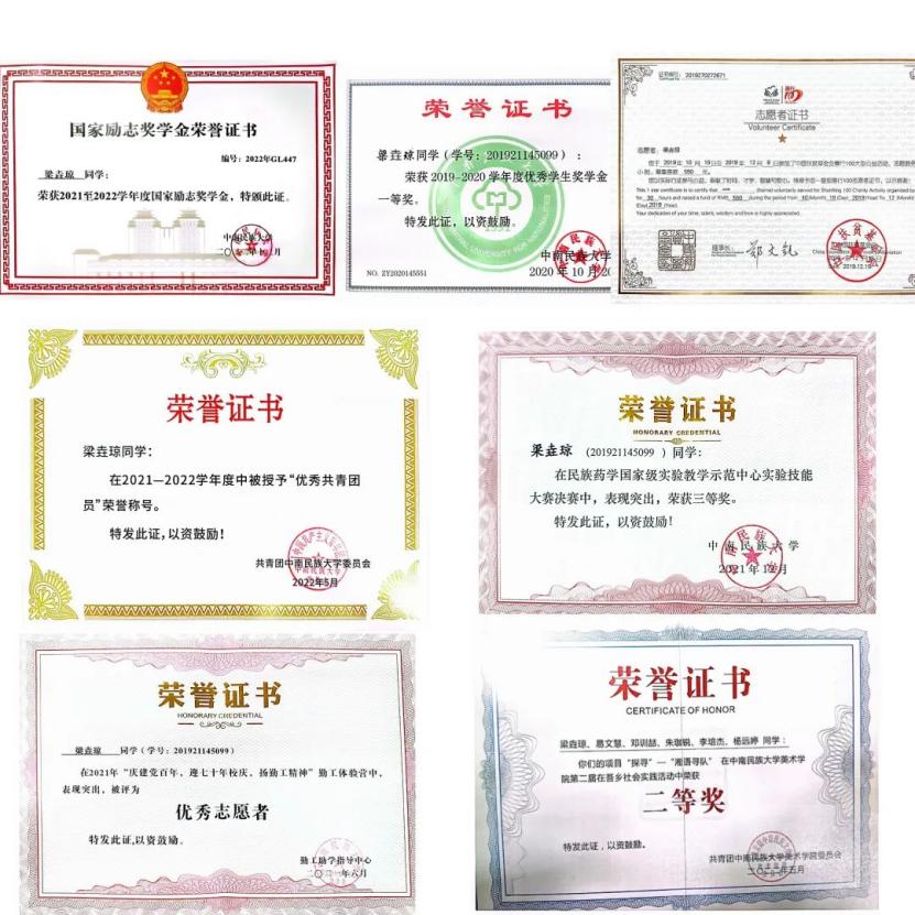 在校期間,她獲國家勵志獎學金、優秀學生獎學金數次,獲中南民族大學自強社2020-2021學年“優秀社員”稱號,被評為2021年勤工體驗營優秀志愿者、2021-2022學年優秀共青團員。競賽方面,獲湖北省十二屆“挑戰杯·中國銀行”大學生創業計劃競賽銅獎、中南民族大學實驗技能大賽三等獎等獎項。