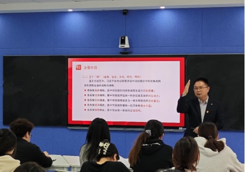 賀展從“兩個大局”的高度和“兩個結合”的深度來引導大家深刻理解鑄牢中華民族共同體意識是習近平總書記作出的重大原創(chuàng)性論斷,是馬克思主義民族理論中國化時代化的最新成果。他通過對比歷屆全國民族團結進步表彰大會盛況來介紹我校中華民族共同體學院(研究院)被中共中央、國務院授予“全國民族團結進步模范集體”榮譽稱號的含金量。這不僅是榮譽,也代表著黨和國家沉甸甸的信任與責任。他還分享了在表彰大會中的見聞與感想,讓同學們深刻領會了習近平總書記在全國民族團結進步表彰大會上發(fā)表重要講話中蘊含的深刻道理。