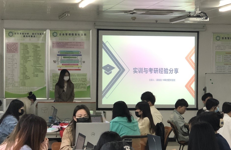 會上還請到了18級信管實驗班的兩位學姐與學弟學妹們交流她們的實訓心得。