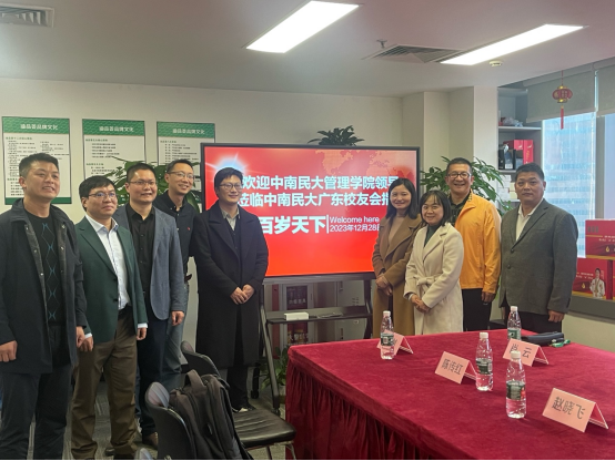為貫徹落實學校關于“訪企拓崗”促就業專項行動工作部署,對接用人單位需求,拓寬畢業生就業渠道。2023年12月27日至28日,管理學院院長翟華云、副院長趙曉飛、電子商務教工黨支部書記陳傳紅、旅游管理教研室主任王劍、人力資源教研室主任毛忞歆及毛冠鳳副教授一行,赴深圳、廣州兩地開展訪企拓崗活動,并與廣東省中南民族大學校友會進行了友好的座談。