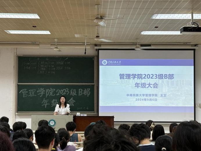為幫助學生厘清學業(yè)規(guī)劃路徑和明確日常管理要求,9月6日下午,管理學院2023級B部于11棟100教室召開年級大會,近240名學生參會。會議由2023級輔導員王衛(wèi)主持。