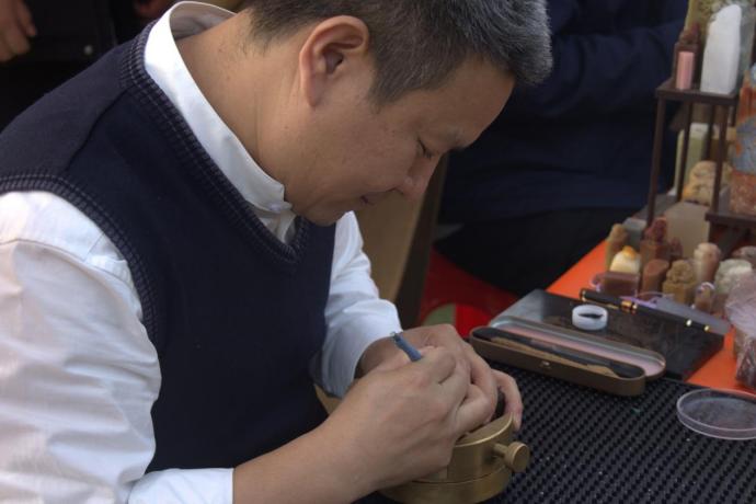 活動伊始,管理學院黨委副書記李明亮在印章書簽制作區親自操刀,為同學們展示印章雕刻的精湛技藝。隨著刀鋒的游走,“篤信好學 自然寬和”“逢考必過”“道法自然”等精美圖案躍然章上,引得同學們紛紛圍觀贊嘆。在完成示范作品后,李明亮更是鼓勵同學們大膽嘗試,親自動手制作印章圖案來裝飾書簽。在他的帶動下,同學們熱情高漲、躍躍欲試,攤位前迅速排起長隊。同學們充分發揮創意,將飽含文化韻味與個人巧思的印章印于書簽、筆記本之上,現場氣氛熱烈非凡,歡聲笑語不斷。