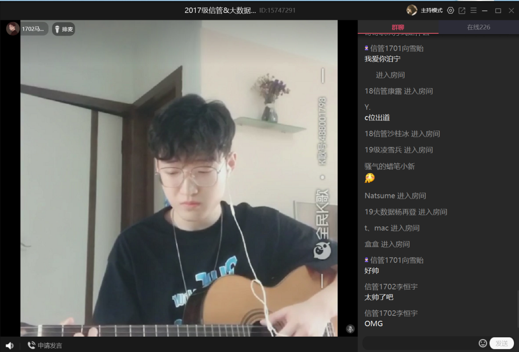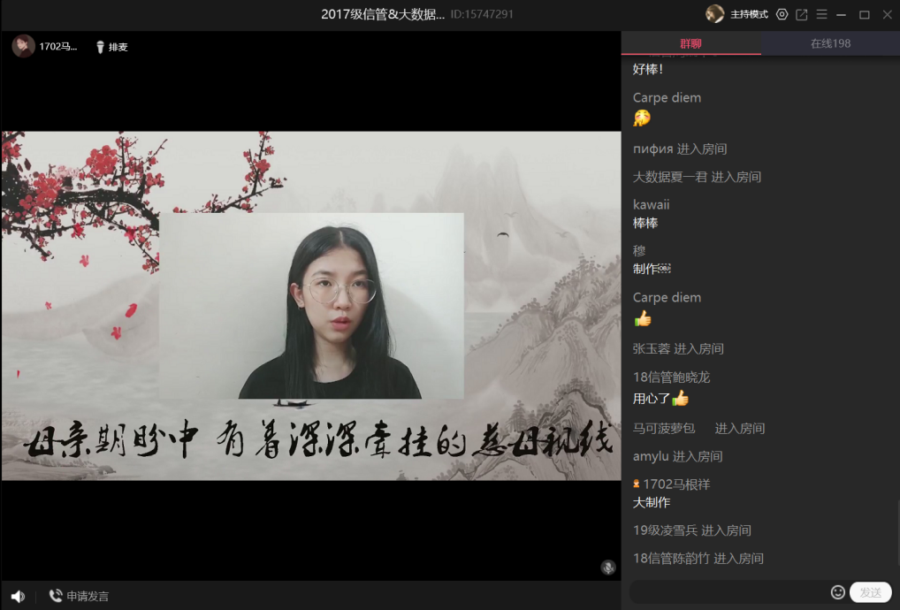 (文字記者:黃冬妮)2020年7月2日晚,中南民族大學管理學院2017級信管“抗疫之夏”線上聯歡會在QQ直播間成功舉行,管理學院張勁松院長、雷長生副書記、信管專業綜合實訓教師指導團隊、武漢凡諾軟件技術有限公司指導團隊、其他院系領導和老師以及二百余名各級信管學子、校友歡聚一堂,共享視聽盛宴。本次晚會由信息管理系精心組織策劃編排,全體參演人員用極具風格的表現力為全場觀眾奉上了一場精彩紛呈的文藝表演。
