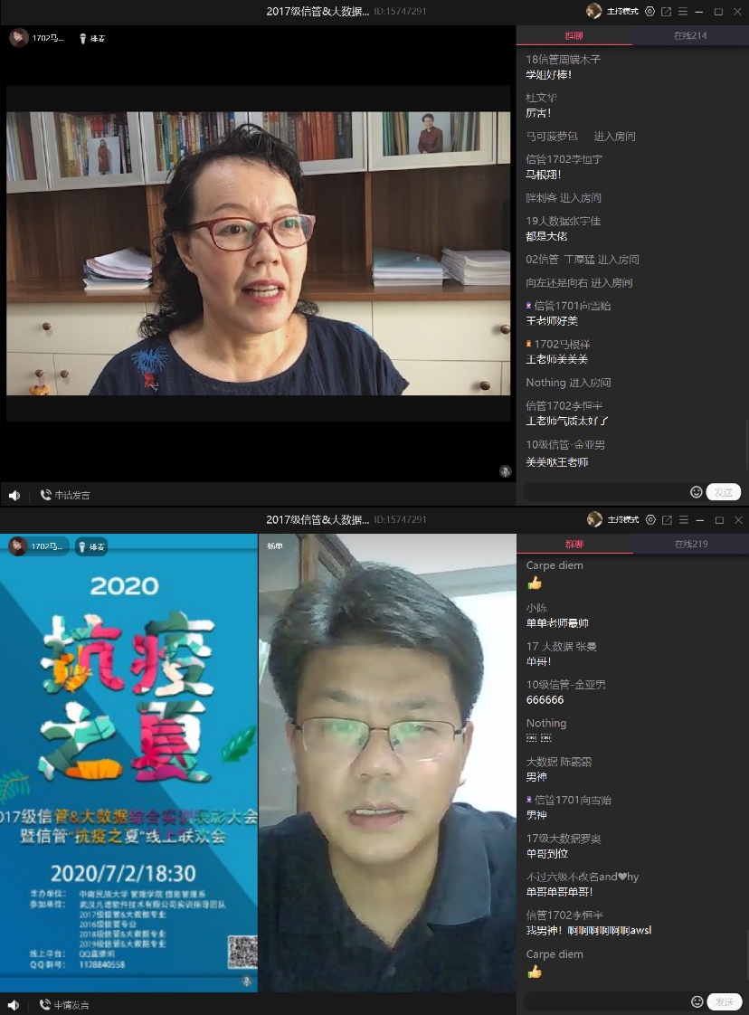 (文字記者:黃冬妮)2020年7月2日晚,中南民族大學(xué)管理學(xué)院召開2017級信管&大數(shù)據(jù)綜合實訓(xùn)線上表彰大會。管理學(xué)院院長張勁松、管理學(xué)院黨委副書記雷長生、信管專業(yè)綜合實訓(xùn)教師指導(dǎo)團(tuán)隊、武漢凡諾軟件技術(shù)有限公司實訓(xùn)指導(dǎo)團(tuán)隊、其他院系領(lǐng)導(dǎo)和老師以及二百余名信管學(xué)子、校友共同參與。