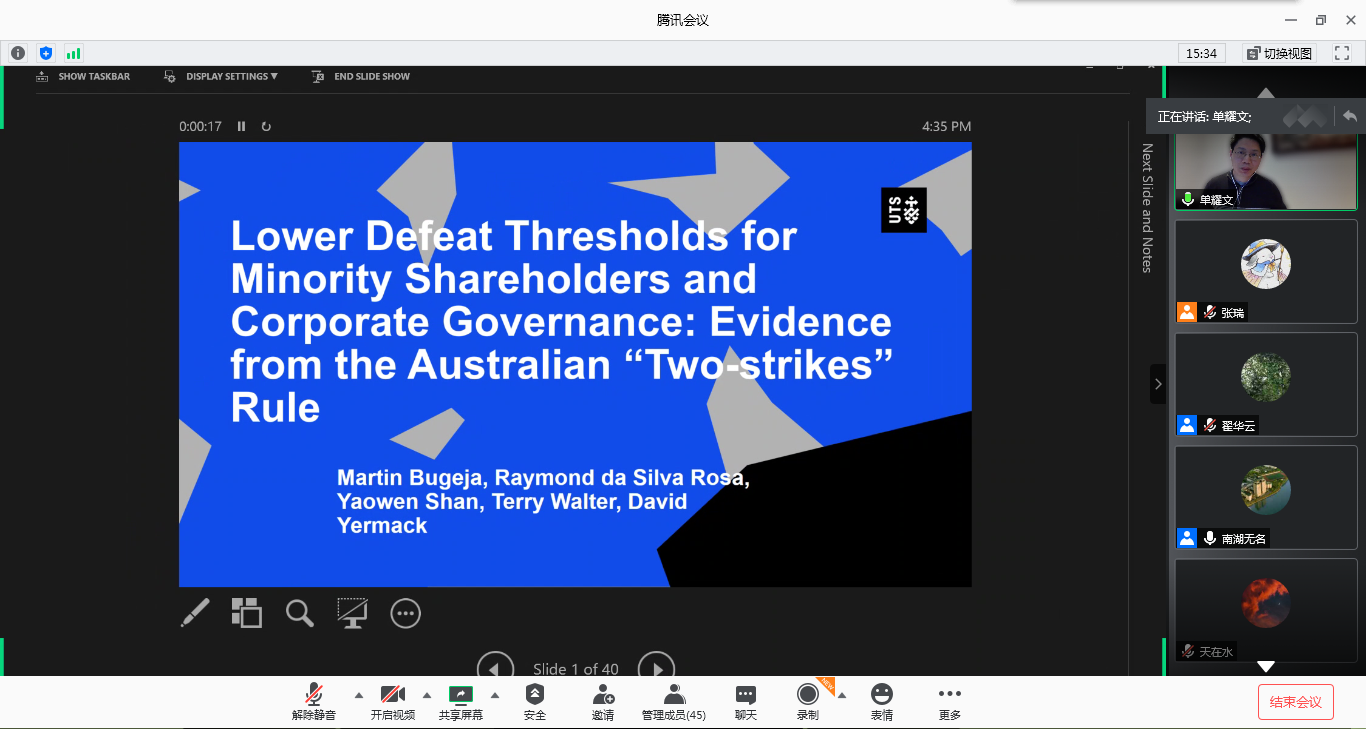 (文字記者:張瑞)2020年7月17日上下午,應學校管理學院邀請,Australian Journal of Management(SSCI)雜志副主編、悉尼科技大學商學院單耀文副教授通過視頻會議為我院師生做了主題為“Lower Defeat Thresholds for Minority Shareholders and Corporate Governance: Evidence from the Australian "Two-strikes" Rule”的學術講座。講座由管理學院院長、張勁松教授和副院長、翟華云教授主持,管理學院老師和研究生共40余人在線收聽和學習。