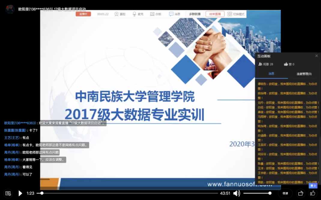 此次啟動會標志著“商務數據分析綜合實訓”正式進入為期四周的實訓階段。首先,凡諾公司歐陽旻老師主持開場,對綜合實訓的后續安排作出了詳細說明,提出了新形式和新要求。在疫情期間,專業綜合實訓開啟網絡授課模式,從學生簽到、小組會議、項目管理周會,再到周志、開發文檔以及實習報告,均采用在線管理模式,遵循線下系統軟件開發流程有序推進實訓進度。歐陽老師指出要在上學期信管專業綜合實訓的基礎上繼續深入開發,運用大數據工具實現數據分析功能是重中之重。