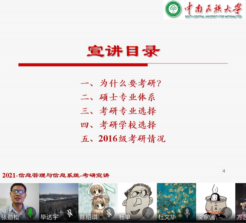 隨后,楊單老師對比了歷年來本系學生考研、就業的數據,結合之前收集的17信管和大數據考研就業的問卷調查數據,從數據的角度對考研就業的基本情況作了詳細分析和說明,并向同學們提出了幾點建議,準備就業同學在疫情期間要做到“四個需要”:需要明確就業方向、需要鞏固課程理論知識、需要積極參與線上線下實習、需要務實專業技能;準備考研同學要做到“四個堅持”:堅持方向目標不動搖、堅持積極獲取外界信息、堅持充分利用各方資源、堅持與師長交流和溝通。