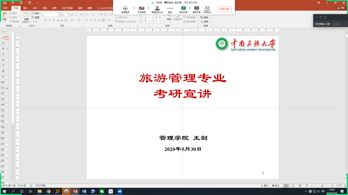 (文字作者:王劍)為進一步做好疫情期間2017級學生就業考研指導工作,2020年5月30日,管理學院旅游管理教研室在騰訊會議平臺召開2017級學生考研就業動員會。旅游管理教研室主任王劍、黨支部書記吳海倫以及2017級旅管專業全體同學參加會議。
