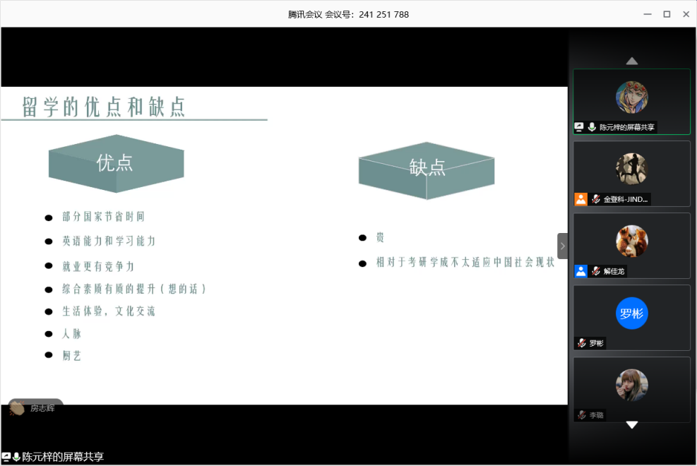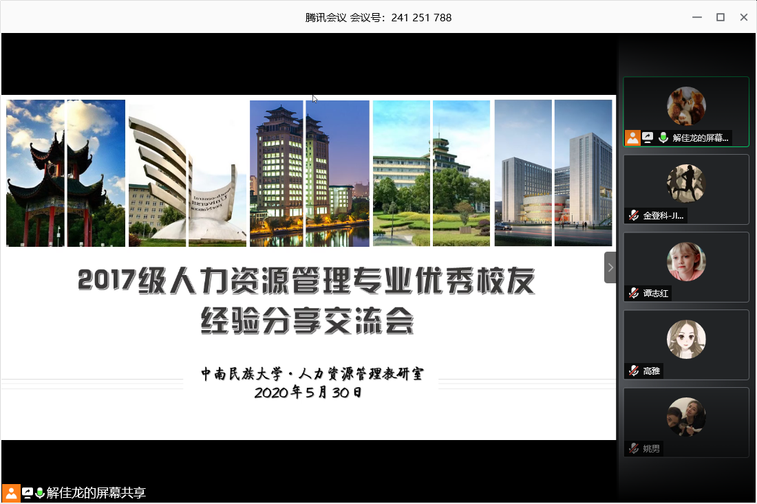 (文字記者:金登科)2020年特殊的疫情給我們帶來了巨大的影響,但并沒有阻擋學生們的奮進步伐。為了更好地幫助2017級人資專業學生明確自身目標,厘清發展規劃,堅定奮斗信心。2020年5月30日18:30,由人力資源管理教研室組織并整合各方資源,邀請了本專業近年在就業、考研、留學、公考等方面取得優異成績的畢業生,大家相聚云端,開啟了一場別開生面的云交流分享會。