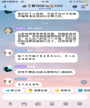2019級A部輔導員李丹老師提前謀劃,以班級為單位,由各班班委帶領本班同學一起在線上學習。在學習期間,同學們認真做好防騙試題,積極表達了對于此次學習的感悟,并通過QQ群與本班同學分享了防詐騙的知識和技巧。同學們拓寬了防詐騙相關知識,同時也提高了個人警惕性。