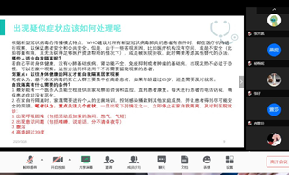 團會開始之際,主講人首先向我們粗略介紹了今天所講內容,接著用以親切的口吻向同學們介紹新冠狀病毒的命名、出現、引起的關注以及主要癥狀;隨后播放關于疫情防護的視頻來加深同學們對疫情的了解,并提及其相關防護措施前,詢問了同學們對防護疫情所了解到的相應措施。