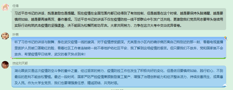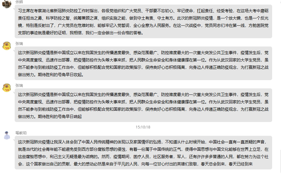 第一個部分,書記魯楠與疫情期間在家居家隔離和在線學習的黨員同志身體健康、學習狀況等表達了自身的慰問。