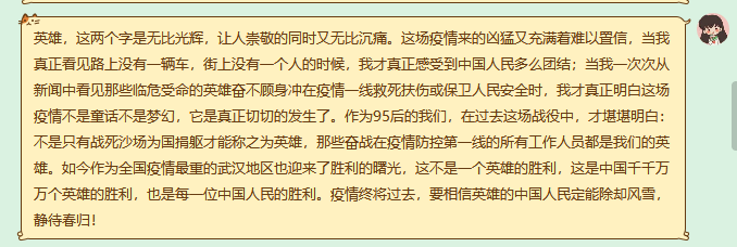 再次,每一位黨員同志對本次肺炎疫情防控結合自身經歷作出發言,對今后疫情的狀況大家有一個什么樣的看法。身處湖北武漢的葉萌同志經歷十分深刻,她表示本次疫情抗戰之中,最美的逆行天使值得我們致上最高的敬意。在疫情大爆發的時期,社區志愿者和黨支部下沉干部為社區服務,不畏艱險不怕困難,在居民需要的時候伸出雙手,值得人們敬佩。任倩同志表示,習近平總書記的講話不僅在疫情防控一線干部群眾中引發廣泛共鳴,更激勵我們黨員同志要帶頭繼續用實際行動構筑抗擊疫情的堅強堡壘,決不能因為松懈而前功盡棄。大家共同努力,力爭在這次大考中交出優異答卷。