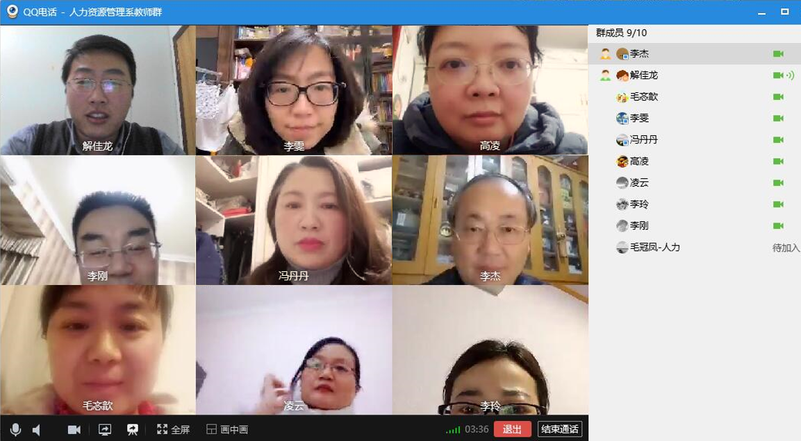 藏歷新年前夕,習近平總書記給在北京大學首鋼醫(yī)院實習的西藏大學醫(yī)學院17名臨床醫(yī)學專業(yè)本科生的回信,近期引發(fā)廣大師生的熱議。人力資源管理教研室于2020年3月2日20:00-20:45,組織開展了“習近平總書記給在首鋼醫(yī)院實習的西藏大學醫(yī)學院學生重要回信精神”在線集體視頻學習會議,教研室共10名專任教師,除1名在外訪學教師外均參加了此次視頻學習會議(如圖1)。