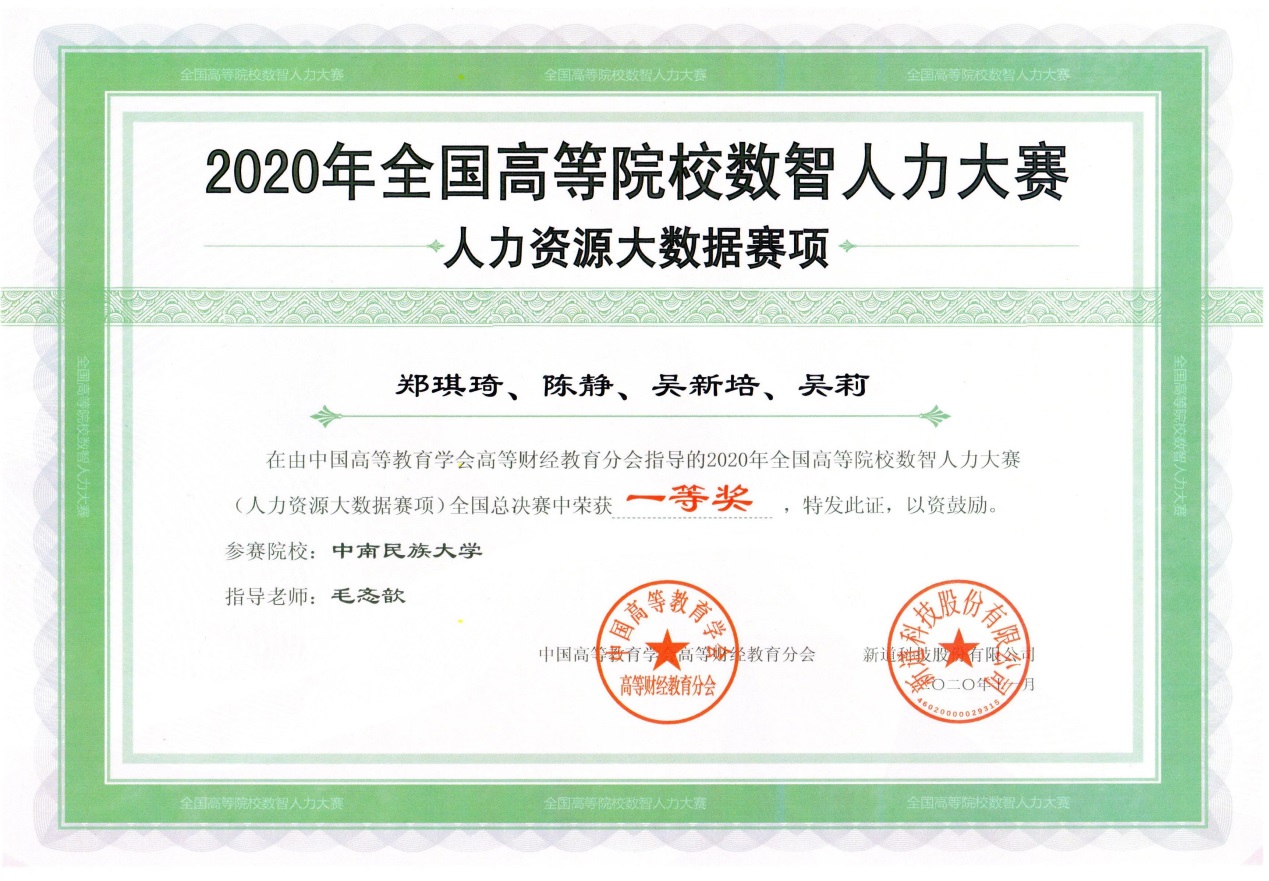 (文字記者:陳靜,解佳龍)2020年11月17-21日,2020年全國高等院校數智人力大賽(人力資源大數據賽項)全國總決賽通過網絡舉行。我院2018級人力資源管理專業的鄭琪琦、吳莉、吳新培和2018級大數據實驗班的陳靜組成參賽隊伍,在人力資源教研室毛忞歆老師指導下,繼今年7月份榮獲省賽一等獎后,代表我校闖入全國總決賽,在總決賽中頑強拼搏、表現優異,最終取得本科組全國一等獎的優異成績。