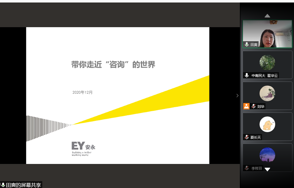 (文字記者:鄒允桃)2020年12月5日上午,管理學院會計系邀請安永(中國)企業咨詢有限公司北京分公司田爽經理為我院學子進行線上講座。2018級、2019級會計實驗班、會計班同學參與了此次講座。