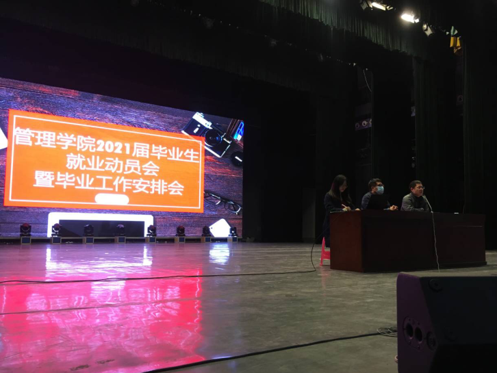 為積極推進(jìn)管理學(xué)院2021屆畢業(yè)生就業(yè)工作,鼓勵廣大畢業(yè)生提升就業(yè)意識和行動力,2020年10月26日晚6:30,管理學(xué)院在學(xué)校大禮堂召開2021屆畢業(yè)生就業(yè)動員會暨畢業(yè)工作安排會。學(xué)院黨委副書記雷長生、副院長李超鋒、2021屆輔導(dǎo)員王宇娟以及全體2021屆本科畢業(yè)生參加了就業(yè)動員大會。會議由黨委副書記雷長生主持。