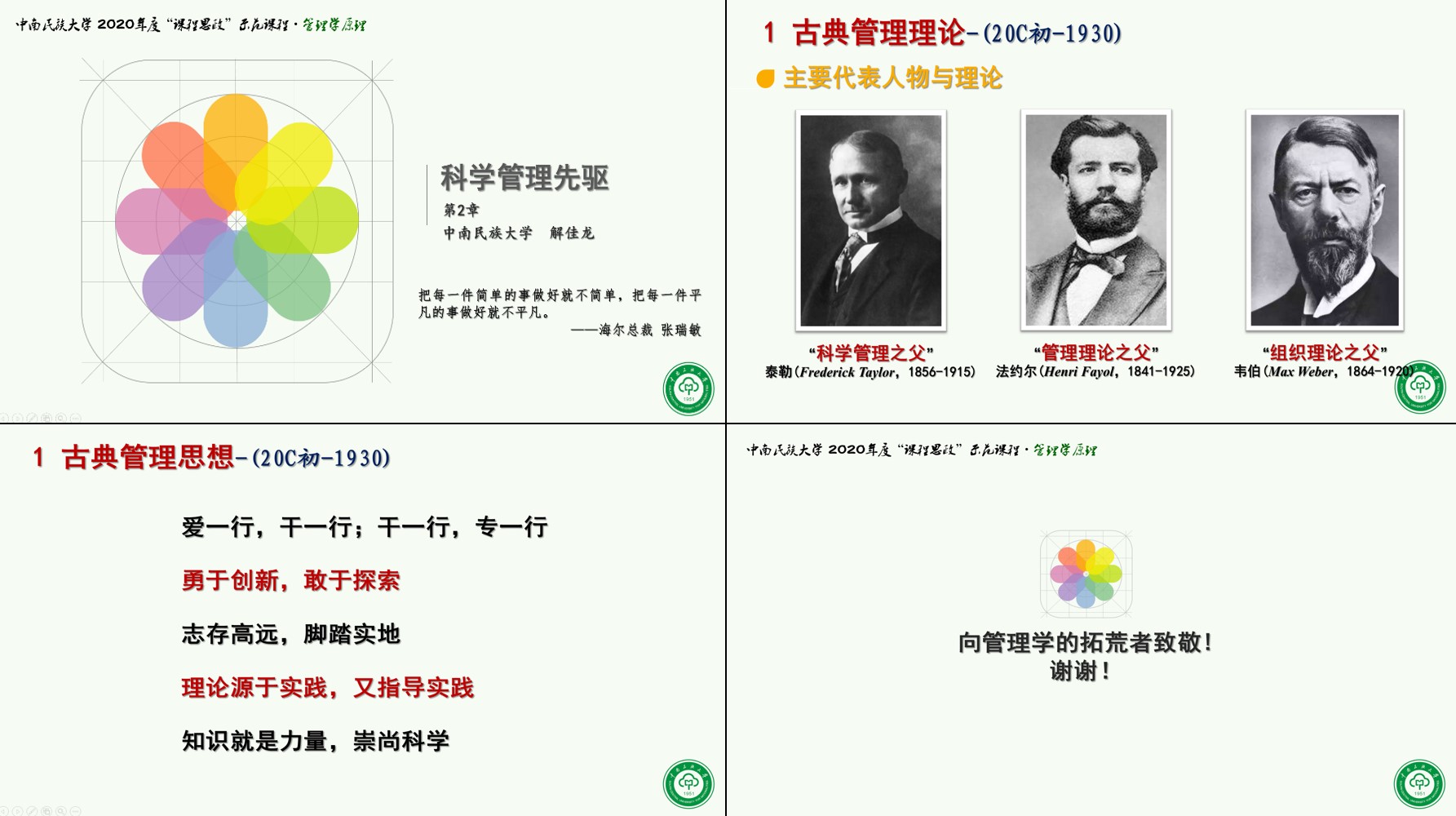 從刀耕火種的原始群居生活到萬里長城、金字塔等氣勢宏偉的古建筑,再到到民族快餐知名品牌真功夫,解老師通過導入一張張熟悉的圖片,引發大家對管理實踐、管理思想、管理理論相互關系的思考,從而拋出將管理真正引向科學的古典管理時期“大家”,開啟了管理理論的百年成長之路。