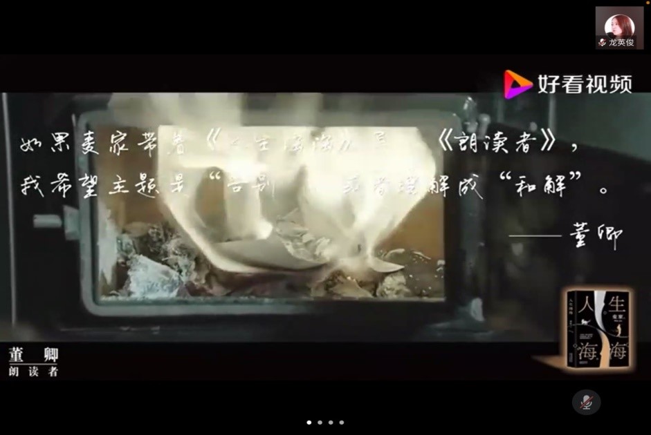 第二位分享的是龍英俊同學,她主要從《人生海?!窌腥宋?/span>“上校”的經歷和性格特點入手,發表了她的觀點和看法:“上校差不多活了一個世紀,人人海海,他的一生經歷了很多事,見過很多人,當過木匠,當過軍官,當過醫生,養過蠶,每一件事情都做得非常出色,他就是一個活著了不起的人。”并且得出了“沒有完美的人生,不完美才是人生”的感悟。