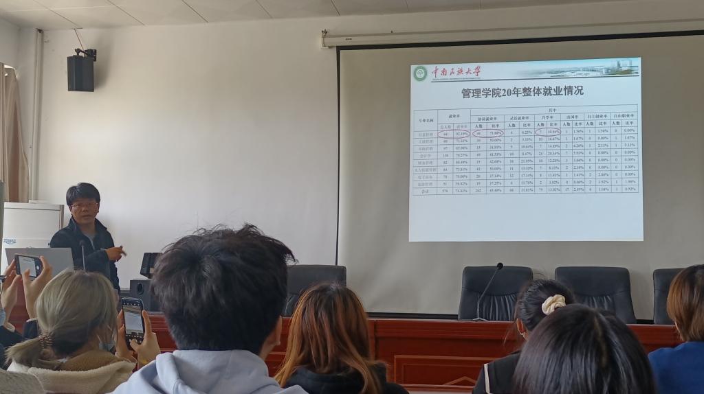 隨后,楊單老師對比了歷年來信管系學生考研、就業的數據,結合之前收集的18信管和大數據實驗班考研就業的問卷調查數據,從數據的角度對考研就業的基本情況作了詳細分析和說明,并向同學們提出了幾點建議,準備就業同學要做到“四個需要”:需要明確就業方向、需要鞏固課程理論知識、需要積極參與實習、需要務實專業技能;準備考研同學要做到“四個堅持”:堅持方向目標不動搖、堅持積極獲取外界信息、堅持充分利用各方資源、堅持與師長交流和溝通。