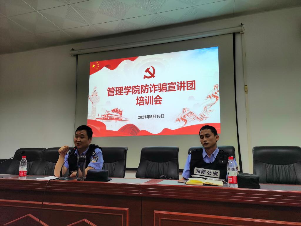 (文字記者:白才讓?zhuān)樽龊脤W(xué)生安全管理工作,維護(hù)校園和諧穩(wěn)定,進(jìn)一步增強(qiáng)防電詐宣傳團(tuán)宣講效果,5月16日晚,管理學(xué)院舉辦防電詐宣講團(tuán)培訓(xùn)會(huì)。培訓(xùn)會(huì)邀請(qǐng)鐵箕山派出所羅浩警官主講,管理學(xué)院防電詐宣講團(tuán)成員、全體輔導(dǎo)員參加,會(huì)議由雷長(zhǎng)生主持。