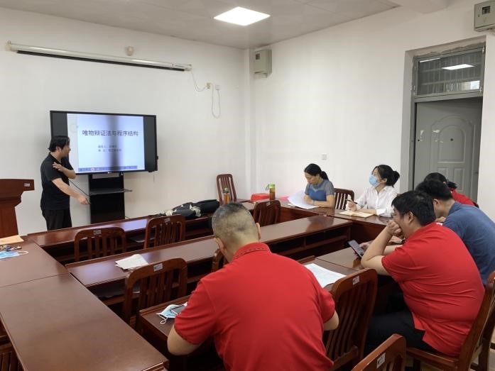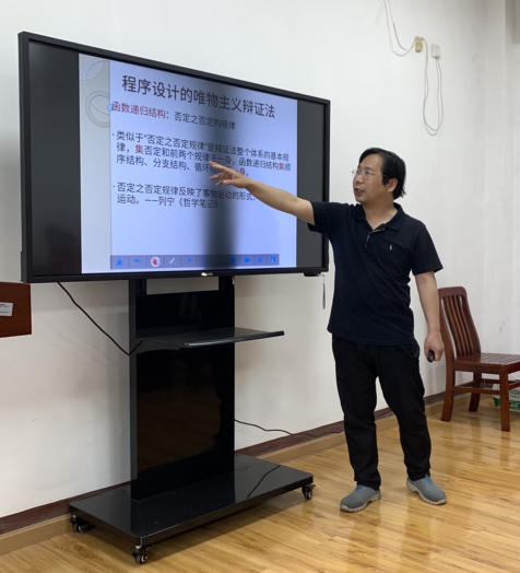 本月黨課由支部黨員羅惠平同志主講《唯物辯證法與程序結構》。本次黨課內容是羅惠平同志從自己撰寫的工作論文中開發出來的。該工作論文是羅惠平同志將自己學習馬克思哲學尤其是唯物辯證法的心得體會,與自己主講的《程序設計》課程相結合的思想成果。羅惠平同志將程序設計的順序結構與事物發展一般規律;分支結構與對立統一規律;循環結構與質量互變規律;函數遞歸結構與否定之否定規律進行了類比分析。