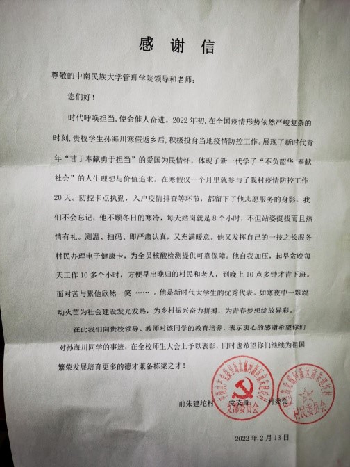 “時代呼喚擔當,使命催人奮進”。2022年3月13日,管理學院收到一封來自河北省秦皇島市北戴河新區(qū)留守營管理處前朱建坨村的表揚信,感謝一位叫孫海川的同學在家鄉(xiāng)抗疫中的表現。