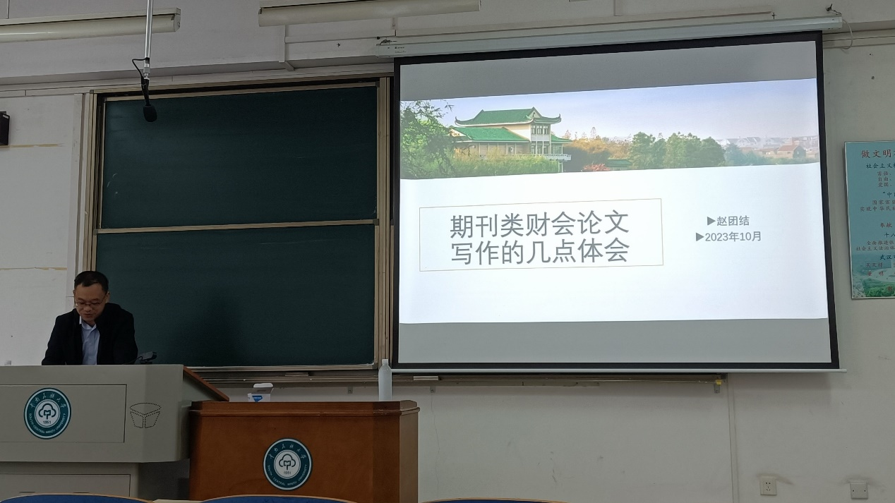 2023年10月13日上午8:00--9:50,我院聘請的湖北省產(chǎn)業(yè)教授、企業(yè)導(dǎo)師、湖北與時投資有限公司董事長趙團結(jié)為我院MPAcc會計專碩學(xué)生作《如何開發(fā)、撰寫與發(fā)表案例文章》專題講座。講座由我院副院長周運蘭教授主持,部分會計與財務(wù)管理的老師也參加了交流學(xué)習(xí)。