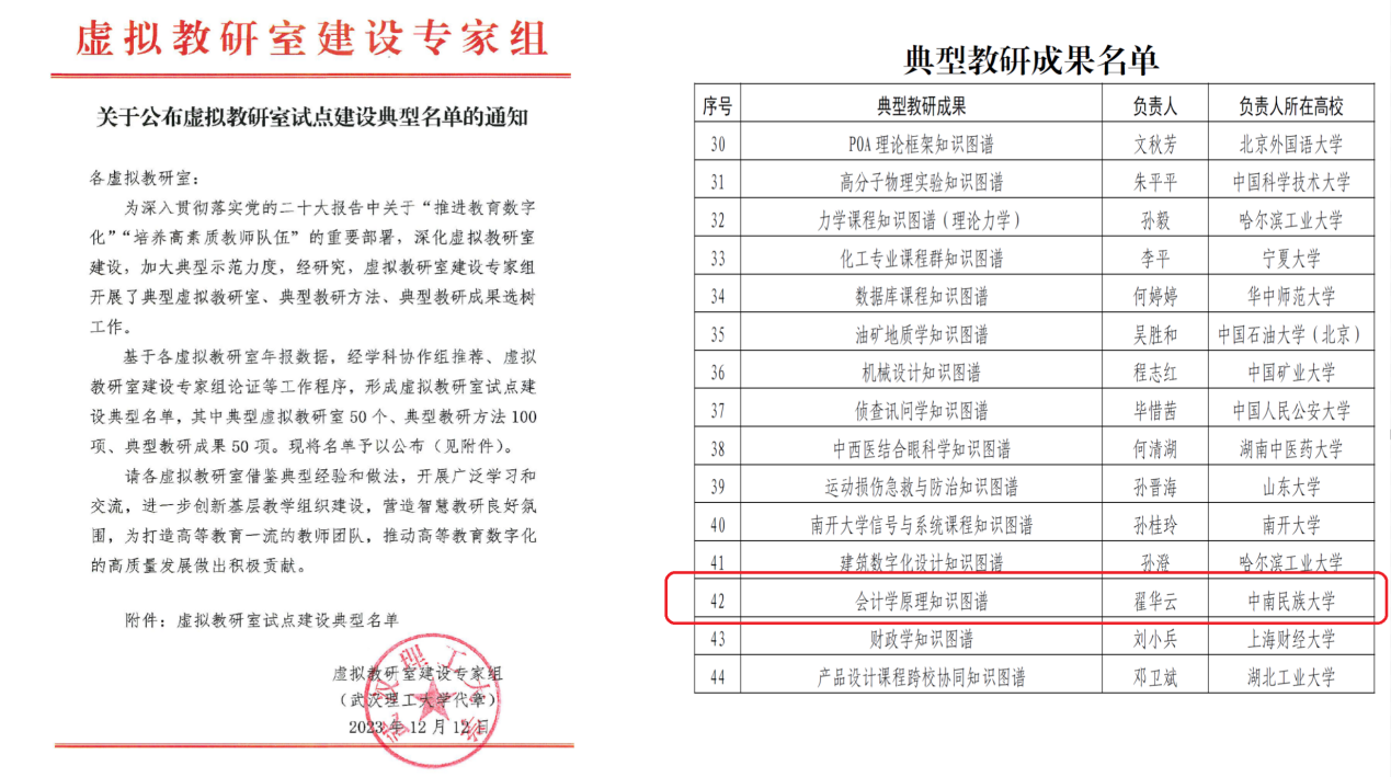 為貫徹落實教育“十四五”規(guī)劃,深入加強虛擬教研室建設(shè),進(jìn)一步鞏固建設(shè)成效,12月23日,2023年虛擬教研室建設(shè)研討會在武漢成功召開。教育部高等教育司副司長高東鋒,虛擬教研室建設(shè)專家組和秘書處成員、協(xié)作組組長代表,以及有關(guān)虛擬教研室代表共200余人參加了會議。會上,我校民族院校會計學(xué)虛擬教研室的“會計學(xué)原理知識圖譜”建設(shè)入選全國典型教研成果名單,該獎項全國共50名。