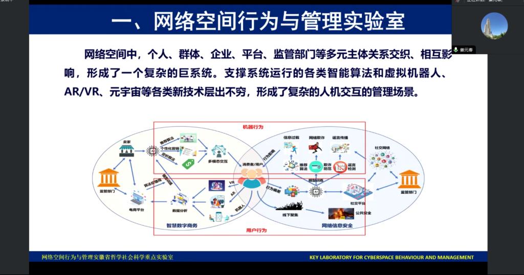 姜元春教授首先介紹了自己團(tuán)隊(duì)的整體研究情況,并簡單介紹網(wǎng)絡(luò)空間行為與管理實(shí)驗(yàn)室的創(chuàng)立背景與基本情況。姜教授開篇講到:以互聯(lián)網(wǎng)為代表的信息技術(shù)日新月異,引領(lǐng)了社會生產(chǎn)新變革,拓展了國家治理新領(lǐng)域。談到網(wǎng)絡(luò)空間,大家首先想到的是信息傳播等方面內(nèi)容,但網(wǎng)絡(luò)空間同時(shí)也是生產(chǎn)生活的新空間和經(jīng)濟(jì)發(fā)展的新引擎,總結(jié)來說前者代表網(wǎng)絡(luò)信息的相關(guān)研究,后者代表電子商務(wù)的相關(guān)研究。姜教授團(tuán)隊(duì)將網(wǎng)絡(luò)空間分為兩大類:電子商務(wù)和全媒平臺。本次講座主要介紹電子商務(wù)領(lǐng)域的研究,電子商務(wù)在推動我國經(jīng)濟(jì)數(shù)字化轉(zhuǎn)型、引領(lǐng)數(shù)字經(jīng)濟(jì)發(fā)展等方面發(fā)揮著越來越關(guān)鍵的作用,是我國經(jīng)濟(jì)高質(zhì)量發(fā)展新動能。姜教授提到現(xiàn)在的網(wǎng)絡(luò)平臺和以前是不一樣的,現(xiàn)在網(wǎng)絡(luò)空間中除了有個(gè)人、群體、企業(yè)、平臺、監(jiān)督平臺之外,還有很多智能算法,形成了復(fù)雜的人機(jī)交互的管理場景,所以網(wǎng)絡(luò)空間管理面臨著安全、公平、可信、可控這四個(gè)方面的挑戰(zhàn)。