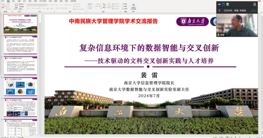 2024年7月25日上午,管理學(xué)院首場(chǎng)暑期“新文科.新融合.新管理”系列講座開(kāi)講。南京大學(xué)教授、博士生導(dǎo)師、信息管理學(xué)院院長(zhǎng)裴雷教授受邀到我院開(kāi)展主題為《復(fù)雜信息環(huán)境下的數(shù)據(jù)智能與交叉創(chuàng)新》的講座。此次講座線上進(jìn)行,由李超鋒副院長(zhǎng)主持,管理學(xué)院師生參加會(huì)議。