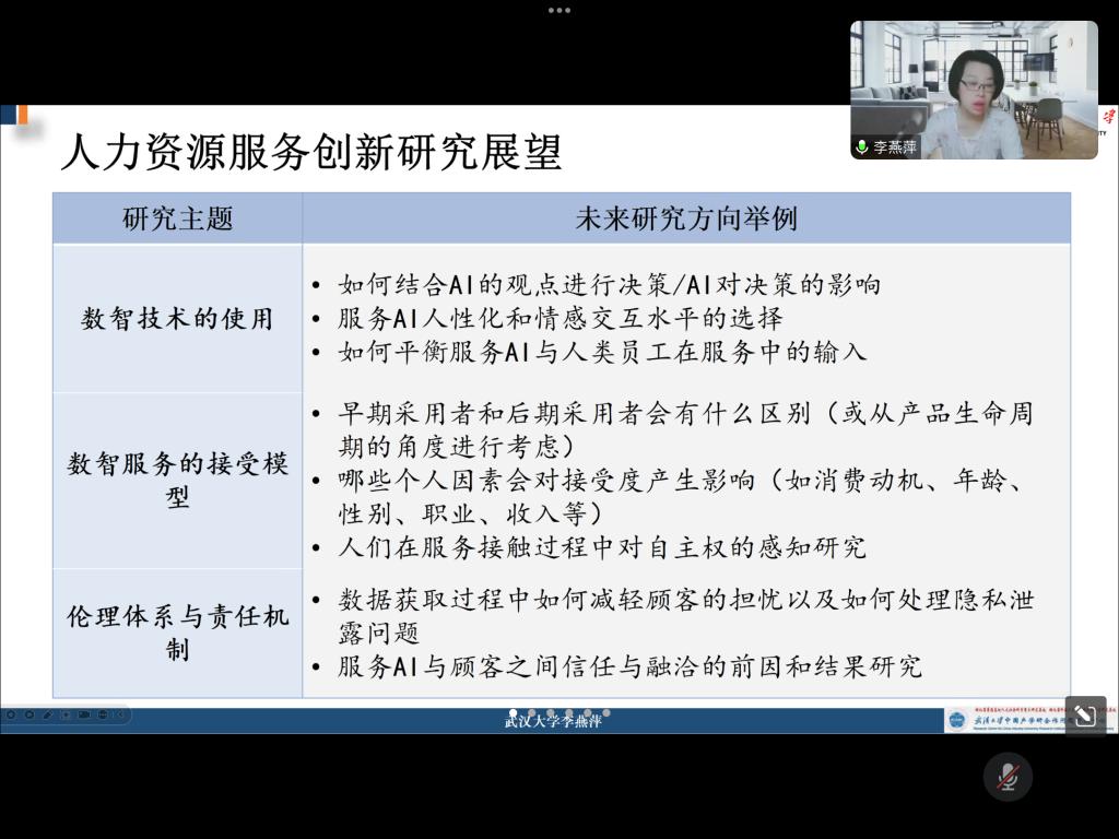 講座還深入探討了數智化賦能人力資源服務創新動力和具體路徑。李教授指出數智化賦能人力資源管理必將成為我國人力資源企業發展的必然趨勢,并列舉了數智化賦能在人力資源管理中的具體應用。李教授還認為,我國企業人力資源數智化從智能化的方向上看就是要實現兩個智能:流程智能和決策智能。在談到人力資源服務企業創新發展路徑時,李教授結合她和她的團隊所做的案例研究進行了詳細的介紹,并提出了技術發展與進步、重塑服務與消費、員工和勞動力市場、跨界與產業融合這四條人力資源服務企業創新路徑。最后李教授還對人力資源服務創新研究進行了展望,提出了一些研究主題以及未來可以研究的具體方向。